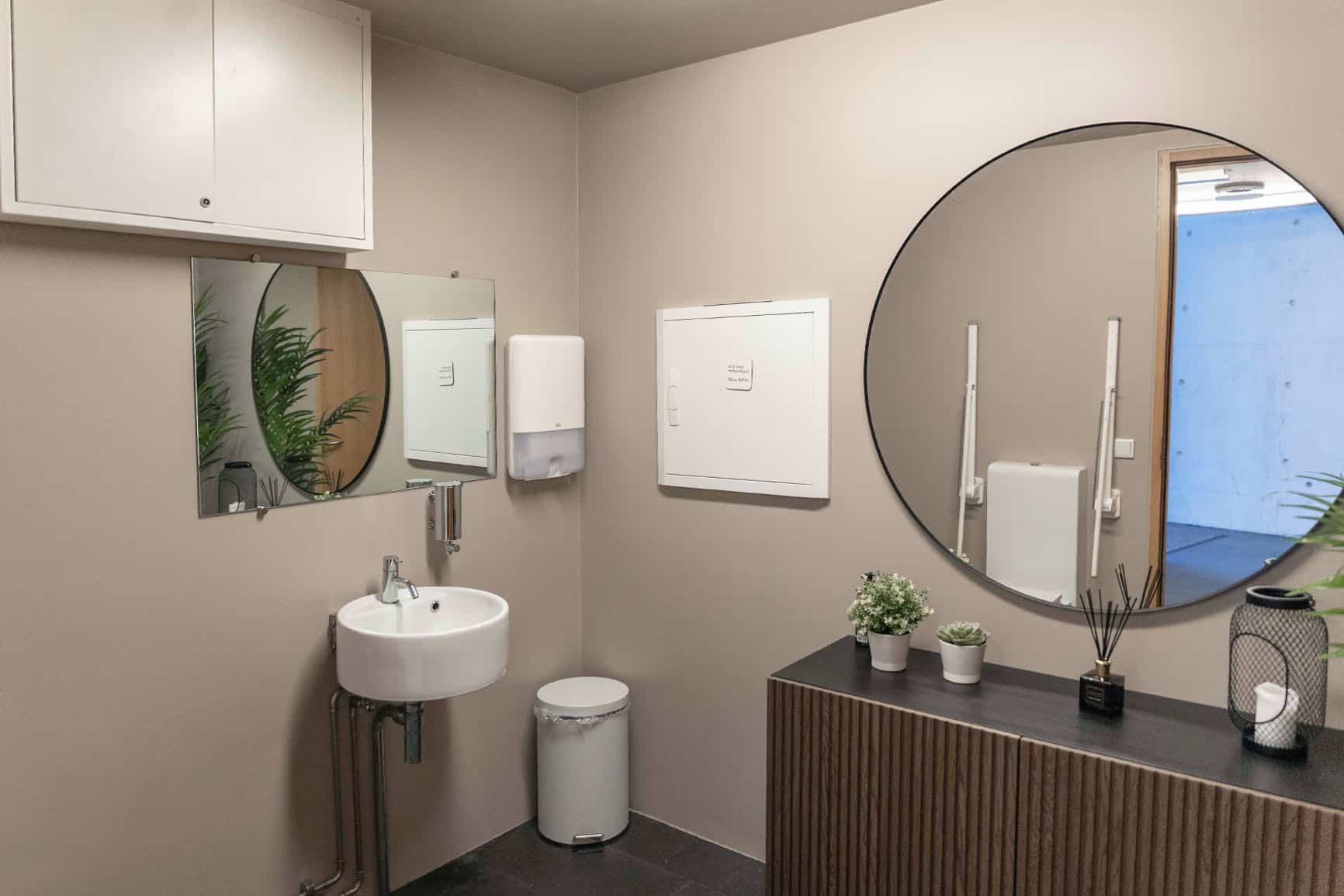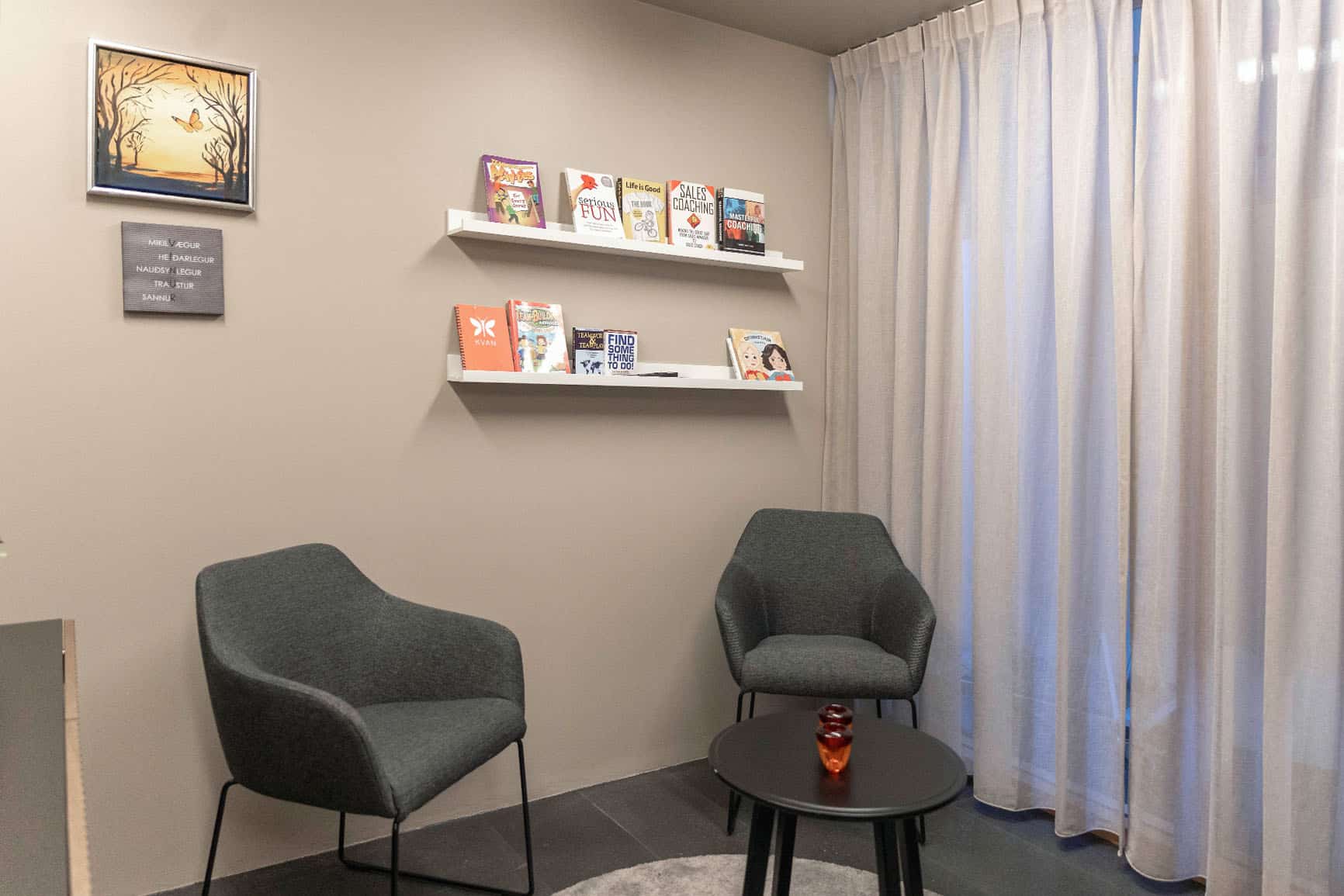 Við enda rýmisins eru stórir gluggar sem hægt er að opna út á veröndina framan við salinn. Í anddyri er lítið viðtalsherbergi fyrir allt að 4 stóla, fatahengi og salernisaðstaða.
