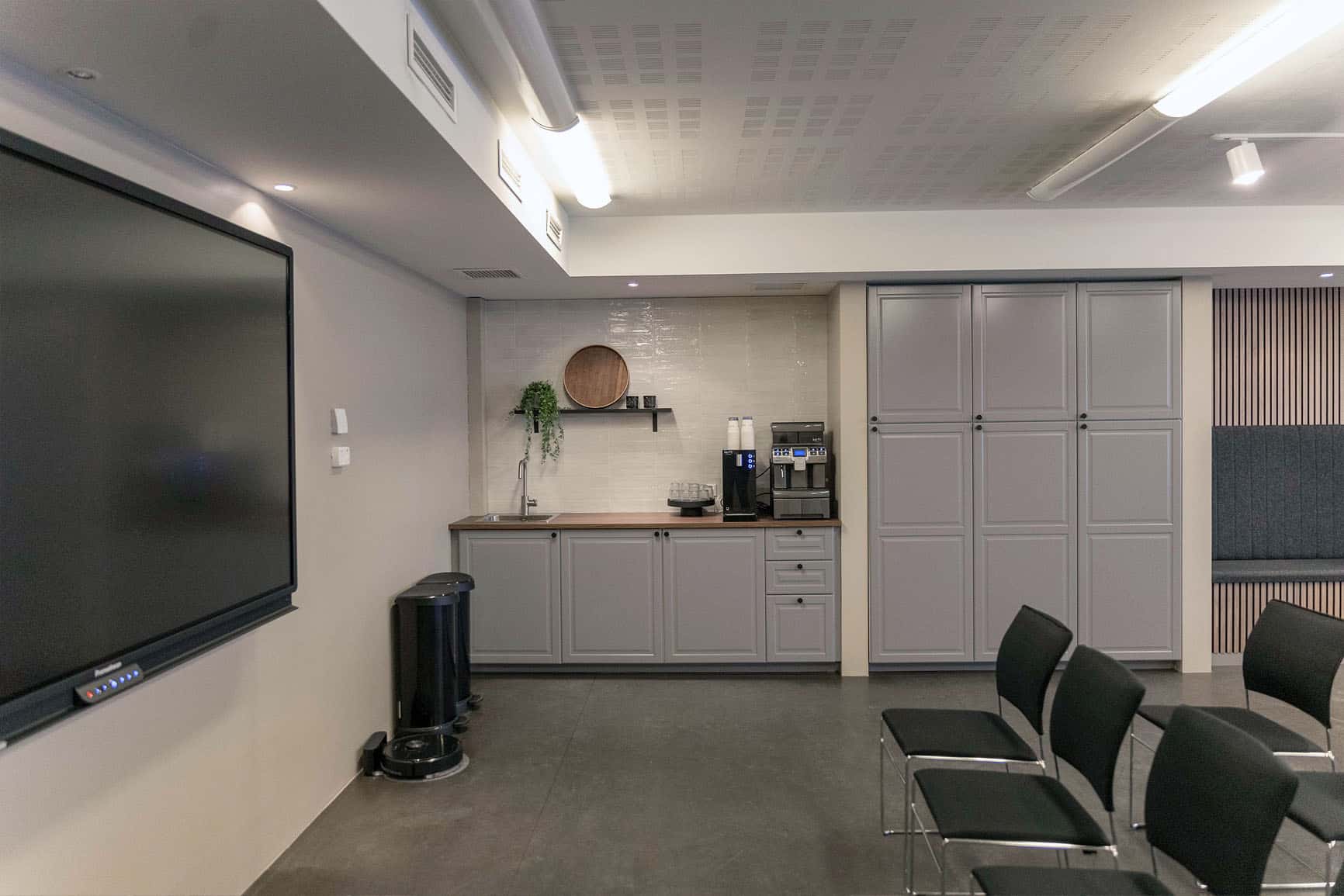 Í salnum er stór og fullkominn snertiskjár. Skjárinn er nettengdur og mögulegt er að skrifa á skjáinn glósur og skýringar á meðan fundi stendur. Eldhúsinnrétting með vask og ísskáp eru í salnum ásamt kaffi- og vatn/sódavatnsvél. Ekki er eldunaraðstaða né uppþvottavél.